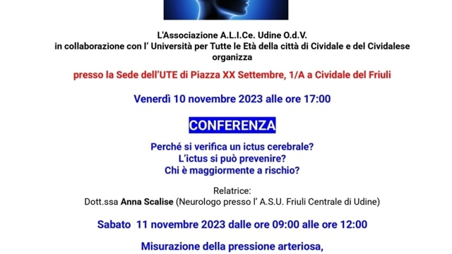 Venerdì 10 novembre 2023 alle ore 17, si terrà una conferenza dal titolo “Perché si verifica un ictus cerebrale? L’ictus si può prevenire? Chi è maggiormente a rischio?” con la relatrice Dottoressa Anna Scalise, neurologo presso l’A.S.U. Friuli Centrale di Udine.