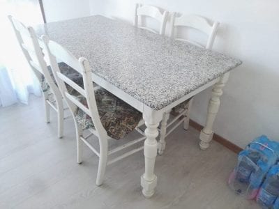 Tavolo usato con ripiano in marmo di gran pregio (il solo ripiano ha un valore che supera i 300€), estremamente liscio (perfetto perfino per il disegno tecnico). Regalo 4 sedie abbinate. Dimensioni: 160 x 80 cm, altezza 78 cm.