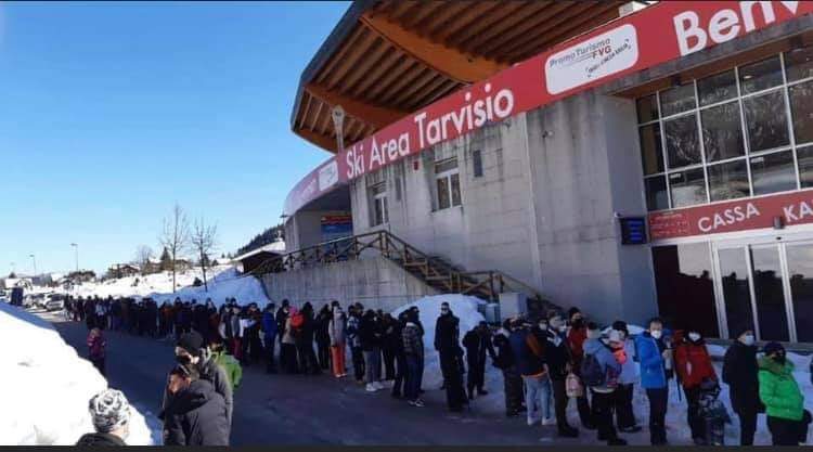 A Tarvisio fin dalle prime ore di questa mattina un lungo serpentone si è messo in fila per la cabinovia sul Monte Lussari, regolarmente aperta. Distanze quasi assenti, mascherine si e no, le immagini hanno fatto, però, subito il giro accendendo le polemiche. Situazione simile a Forni di Sopra, dove si aveva l’impressione che la stagione invernale fosse ufficialmente iniziata.