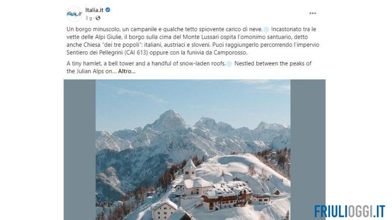 Sulla pagina ufficiale del sito del turismo italiano (seguita da oltre mezzo milione di persone) è stata infatti pubblicata un’immagine di questa perla friulana. “Un borgo minuscolo, un campanile e qualche tetto spiovente carico di neve – lo descrive il sito -. Incastonato tra le vette delle Alpi Giulie, il borgo sulla cima del Monte Lussari ospita l’omonimo santuario, detto anche Chiesa “dei tre popoli”: italiani, austriaci e sloveni. Puoi raggiungerlo percorrendo l’impervio Sentiero dei Pellegrini (CAI 613) oppure con la funivia da Camporosso”.