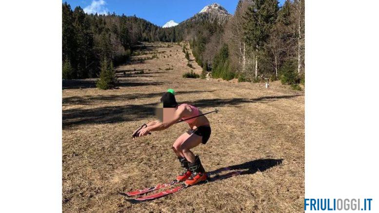 C’è chi scia in ambiente classico e chi “su prato”: una simpatica foto, scattata il 12 marzo, riprende infatti un ragazzo sugli sci, ma in canotta e pantaloncini corti, all’ex pista di slalom di Sella Nevea, completamente priva di neve.