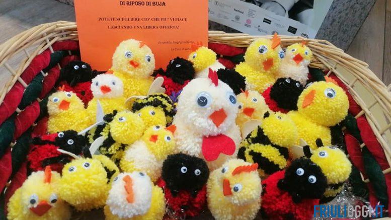 Gli ospiti della casa di riposo di Buia fanno un regalo di Pasqua ai loro compaesani: teneri pulcini colorati, realizzati da loro e messi a disposizione di chiunque li desideri.