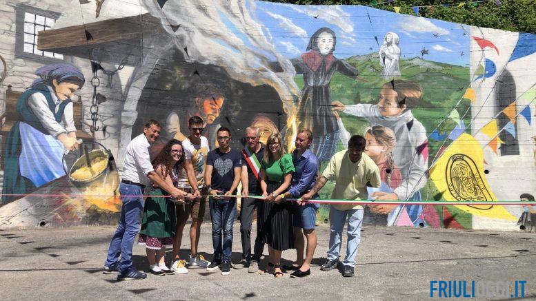 L’opera, realizzata dall’artista Roberto OBI Candotti è stata fortemente voluta dall’Amministrazione e dagli abitanti del Borgo che, negli ultimi 15 giorni, sono stati direttamente coinvolti nella realizzazione del manufatto pittorico. In particolare, hanno aiutato Candotti nella realizzazione del disegno e nella pulizia del grande muro. L’opera, coloratissima, racconta l’identità del luogo e le sue tradizioni (dalla sagra dei cjarsons, al rito pagano della Femenuta), in chiave moderna.