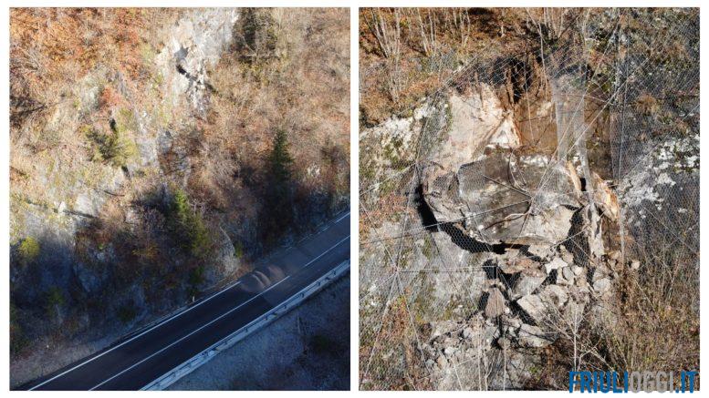 Le reti a protezione della strada ed installate sul versante hanno svolto con efficacia il proprio compito bloccando anche la caduta di un masso, a 25 metri di altezza, che sarà rimosso nelle prossime ore. Il personale di FVG Strade, guidato dal capo centro Alessio Vidoni, è presente sul posto per le operazioni di disgaggio e messa in sicurezza che dovrebbero durare almeno fino a stasera.
