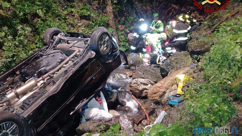 L’auto è precipitata giù dal burrone per 20 metri, poi è atterrata sul torrente sotto la strada, capovolta con le ruote verso l’alto. E’ successo in località Collina nel comune di Forni Avoltri. Ed è questa la situazione che ieri sera 19 agosto si sono trovati davanti i vigili del fuoco del comando di Udine intervenuti con le squadre dei distaccamenti di Forni Avoltri Rigolato e Tolmezzo.