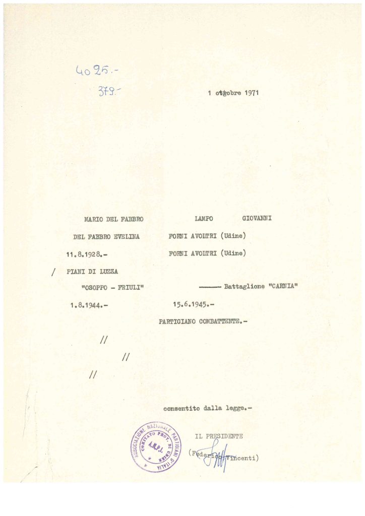 Riconoscimento ufficiale dell’attività da partigiano di Mario Del Fabbro, Archivio Anpi Udine.