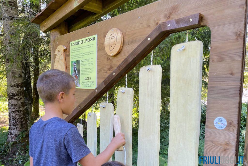 Lungo il percorso è possibile imparare a riconoscere gli alberi e la magia della fotosintesi, utilizzare uno xilofono naturale in legno, camminare scalzi per ritrovare le sensazioni dimenticate, riconoscere le essenze alpine mediante l’olfatto, imitare in diverse forme l’abilità degli animali e molto altro. Il tutto è descritto da appositi pannelli con le istruzioni sulle attività da svolgere. Il parco è stato realizzato dall’azienda Legnolandia utilizzando legno, il materiale da costruzione più rinnovabile al mondo, ricavato a “Km. zero” da foreste certificate PEFC® e lavorato utilizzando energia proveniente esclusivamente da fonti rinnovabili.