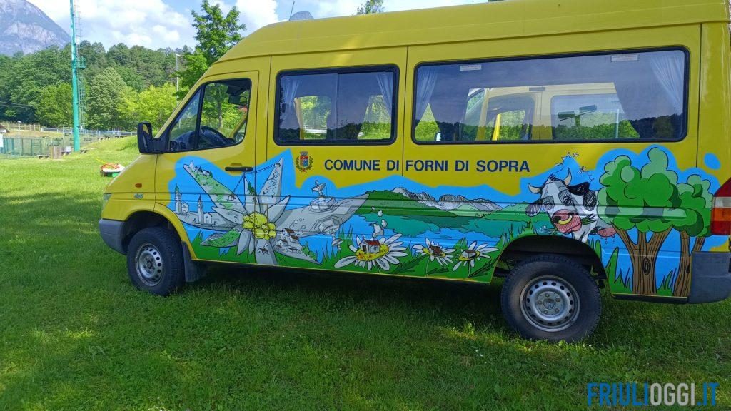 L’idea è quella di superare ogni campanilismo e chi meglio dei ragazzi, che già vanno a scuola assieme, per promuoverla? Ecco allora che gli alunni delle seconde medie hanno realizzato un murales a Forni di Sotto, che è stato riproposto sullo scuolabus di Forni di Sopra.