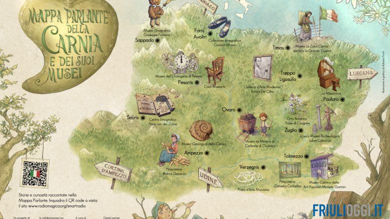 La Mappa Parlante è stata realizzata da Fondazione Radio Magica Ets che ha coinvolto l’artista carnico Adriano Fruch per l’illustrazione d’autore del territorio in cui sono rappresentati una selezione di sedici tra le trentotto realtà espositive della rete di CarniaMusei che si distinguono per autenticità, originalità e offerta di servizi didattici. Dal portale radiomagica.org, alla sezione Mappe Parlanti, oppure inquadrando il QR code presente sulla rappresentazione fisica, l’utente può accedere ai contenuti – in formato audio e testo scaricabile – costruiti appositamente per condividere storie e curiosità dei luoghi mappati. La versione digitale è curata dal Sasweb Lab dell’Università degli Studi di Udine