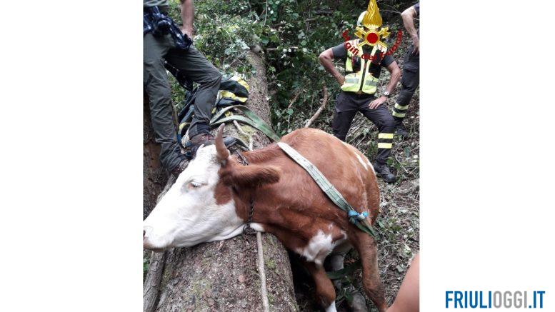 Una mucca è stata recuperata dai vigili del fuoco con l’elicottero, dopo essere caduta lungo un pendio nella zona di Mione di Ovaro.