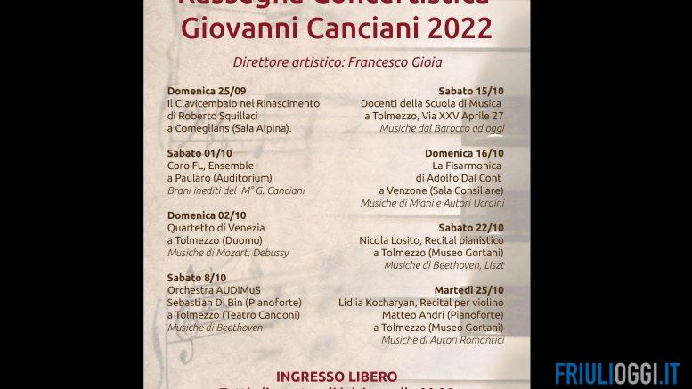 Il primo concerto andrà in scena il 25 settembre: il clavicembalo di Roberto Squillaci suonerà nella Sala Alpina di Comeglians con musiche dal Rinascimento al Barocco e composizioni originali dell’esecutore. L’1 ottobre il Coro FL Ensemble si esibirà a Paularo in Mottetti sacri e Canti profani – alla loro prima esecuzione assoluta – scritti proprio dal Maestro Giovanni Canciani, con la direzione di Federico Lepre. Il 2 ottobre, il celebre Quartetto di Venezia suonerà nel Duomo di Tolmezzo musiche di Mozart e Debussy.