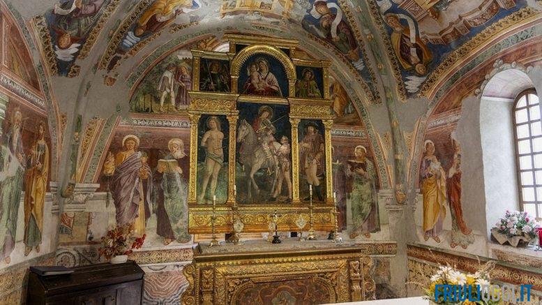 La pala d’altare, incompiuta da Gian Francesco da Tolmezzo e terminata da un autore ignoto, raffigura San Martino insieme a San Sebastiano e San Rocco. Nonostante i recenti interventi di restauro, la chiesa necessita di ulteriori lavori per preservare sia gli affreschi che la struttura architettonica.