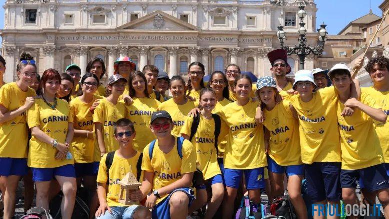 Il papa al termine della preghiera ha salutato i ragazzi dell’oratorio Don Bosco di Tolmezzo. I ragazzi, tutti dai 15 ai 19 anni, hanno ascoltato le parole di Bergoglio con profonda emozione, indossando delle magliette gialloblu realizzate per l’occasione, e mettendo bene in mostra la bandiera del Friuli.