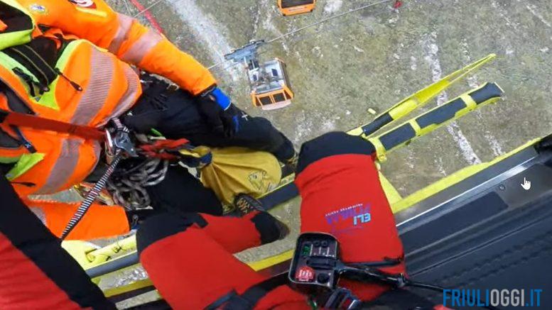 Sospesi a più di cento metri da terra, affidandosi con fiducia al verricello per essere calati su un altro luogo sospeso a funi: la cabinovia; è la spettacolare esercitazione che si è svolta nei giorni scorsi a Sella Nevea dove i tecnici del Soccorso Alpino del Fvg si sono addestrati in caso di guasti agli impianti di risalita.
