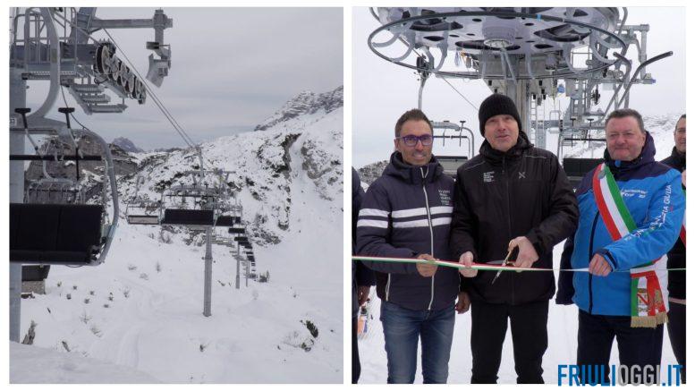 E’ stata inaugurata oggi la nuova seggiovia quadriposto Gilberti nel comprensorio sciistico di Sella Nevea (Chiusaforte). Un intervento strategico che rafforza l’attrattività turistica e la competitività della montagna del Friuli Venezia Giulia. All’inaugurazione hanno preso parte l’assessore regionale alle Attività produttive e turismo Sergio Emidio Bini e i sindaci di Chiusaforte, Fabrizio Fuccaro, e di Resia, Anna Micelli, oltre al direttore generale di PromoTurismoFVG Jacopo Mestroni e ai rappresentanti del vicino comune sloveno di Bovec.