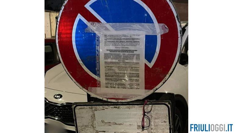 Il cartello di divieto di sosta c’è e si vede bene, solo che l’ordinanza che lo accompagna, su un foglio incollato sopra al segnale, è scritto talmente in piccolo da risultare illeggibile.