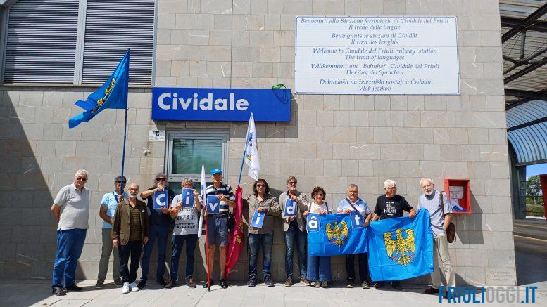La protesta per la rimozione dei cartelli trilingui in stazione a Cividale.