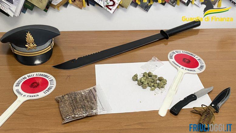 Fermato per un controllo, ha detto che stava andando in vacanza a Grado. Peccato che con sé aveva droga e armi. E’ accaduto nei giorni scorsi, al valico di Stupizza in comune di Pulfero, dove i finanzieri della Compagnia di Cividale del Friuli hanno sottoposto a sequestro un machete, un coltello e un pugnale da lancio, oltre a 45 grammi di “marijuana” e ad un francobollo di LSD, rinvenuti a bordo di un’auto in ingresso in Italia.