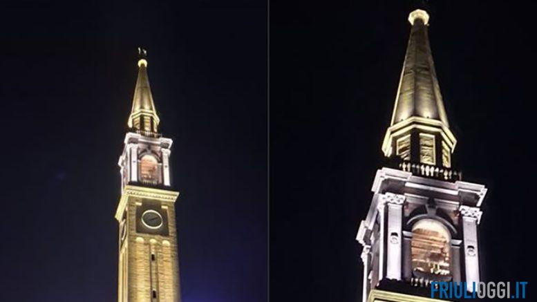 Colpito da un fulmine nel 2021, il campanile di Cordenons è tornato a illuminarsi.