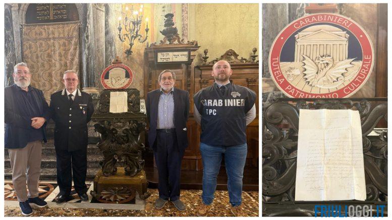 Il 15 maggio 2025, i Carabinieri del Nucleo Tutela del Patrimonio Culturale di Udine hanno riconsegnato alla Comunità Ebraica di Padova un’antica lettera manoscritta datata 1930, corredata da segni di protocollo afferenti a quell’Archivio Storico e un timbro rosso in ceralacca raffigurante la “Stella di David”.