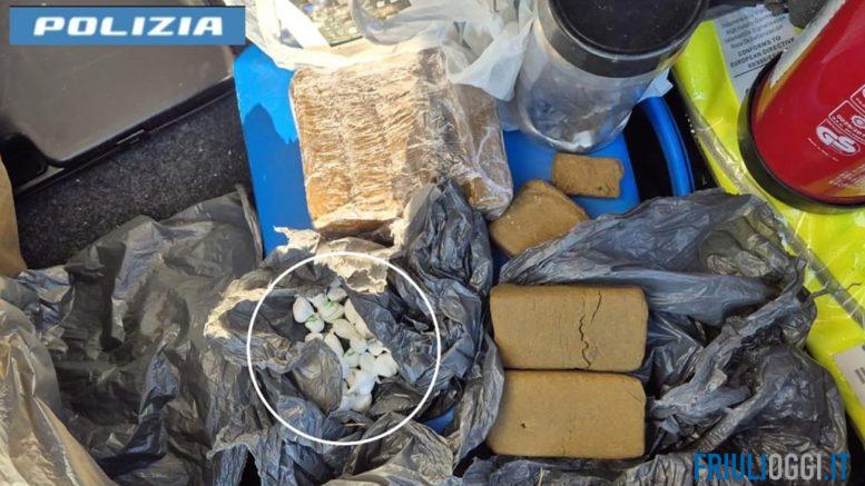Dopo che gli stessi avevano concluso una cessione di 6,6 g di hashish a un automobilista, poi fatto identificare da una Volante e segnalato amministrativamente quale assuntore di stupefacenti, gli agenti hanno fermato i due per un più approfondito controllo, al termine del quale, grazie anche all’ausilio di un’unità cinofila della Guardia di Finanza, nella siepe e nel prato hanno rinvenuto, complessivamente, 2,050 kg di hashish , diviso in diverse “panette” da circa 100 grammi l’una, nonché 102 grammi di cocaina, frazionati in 110 involucri termosaldati da circa 1 grammo, pronti per essere venduti al dettaglio.