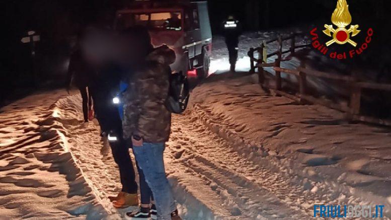 Bloccati con i fuoristrada nella neve, cinque ragazzi recuperati dai vigili del fuoco. Poco dopo le 20.15 di ieri, domenica 8 febbraio, la sala operativa del Comando dei vigili del fuoco di Pordenone ha ricevuto una richiesta di aiuto da parte di alcuni giovani rimasti bloccati con i loro fuoristrada su una strada innevata lungo la dorsale Cansiglio-Cavallo, nei pressi di Casera Friz, nel comune di Budoia.