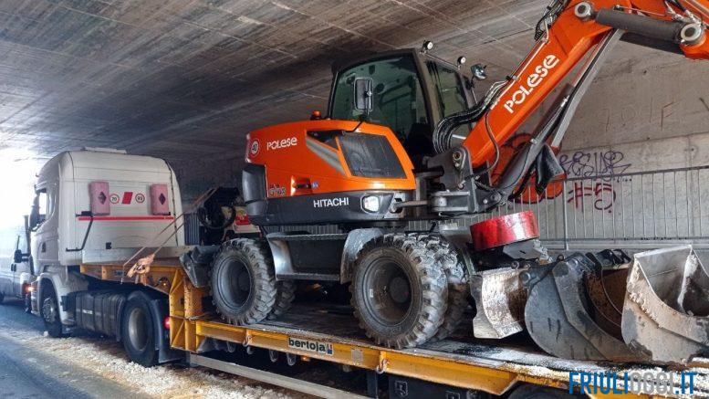 Mattinata movimentata a Codroipo, dove intorno alle 10 un camion che trasportava un escavatore è rimasto incastrato nel sottopassaggio ferroviario di via Pordenone, nel tratto che conduce verso il centro abitato.