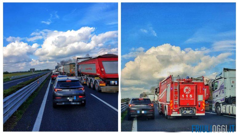 Sul posto sono arrivati i vigili del fuoco, per spegnere le fiamme. Il traffico è bloccato e Autovie Venete ha provveduto a chiudere il tratto in direzione Tarvisio. A chi proviene da Venezia ed è diretto a Udine/Tarvisio viene consigliata l’uscita di San Giorgio di Nogaro; a chi proviene da Trieste ed è diretto a Udine/Tarvisio viene consigliata l’uscita al casello di Palmanova
