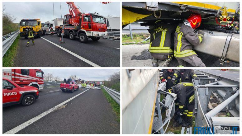 All’arrivo sul posto dei vigili del fuoco, l’autista del mezzo pesante era già uscito autonomamente e illeso dalla cabina di guida. Dopo aver verificato che nel sinistro non vi fossero coinvolti altri mezzi, i Vigili del fuoco hanno iniziato a mettere in sicurezza il mezzo incidentato svuotando con un’apposita pompa ad aria per idrocarburi il serbatoio danneggiato del trattore stradale incidentato. Vuotato il serbatoio i soccorritori hanno iniziato ad operare con le cesoie oleodinamiche per liberare l’autoarticolato dalle parti di guard rail che nell’urto si erano infilate tra trattore e semirimorchio impedendo qualsiasi movimentazione del mezzo. Successivamente con l’autogru hanno sollevato la parte anteriore del semirimorchio mentre un mezzo del soccorso stradale tirava il trattore stradale per raddrizzarlo e riportarlo sulla corsia. Una volta raddrizzato l’autoarticolato, i Vigili del fuoco hanno staccato il semirimorchio dal trattore stradale e gli addetti del soccorso stradale hanno provveduto al trasporto della motrice e del semirimorchio incidentati presso il deposito.