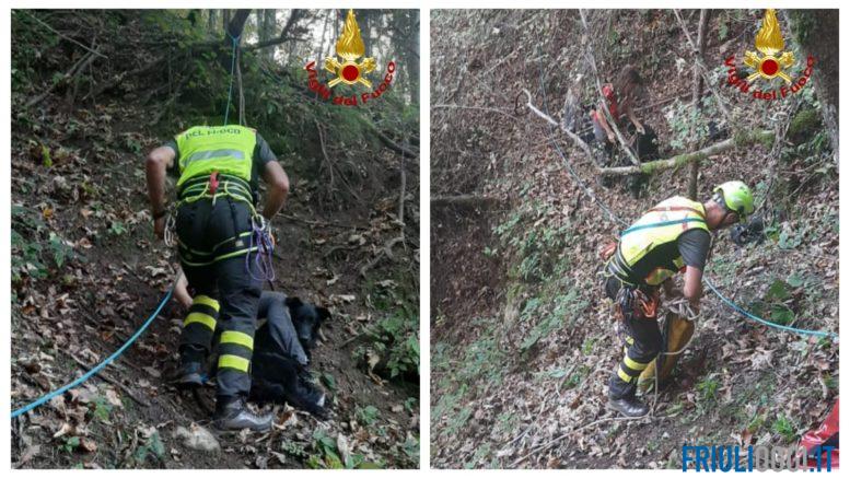 La squadra dei Vigili del fuoco del capoluogo carnico, nella quale era presente anche la componente SAF (Speleo, Alpino, Fluviale), appena giunta sul luogo segnalato ha individuato le due donne all’interno del bosco e, utilizzando un sistema di corde fisse, ha messo in sicurezza le proprietarie del cane. Successivamente un operatore si è calato all’interno del canale tentando di imbragare l’animale ma Poldo, cucciolo di circa sei mesi, era molto spaventato e agitando e rischiava di cadere nel vuoto.