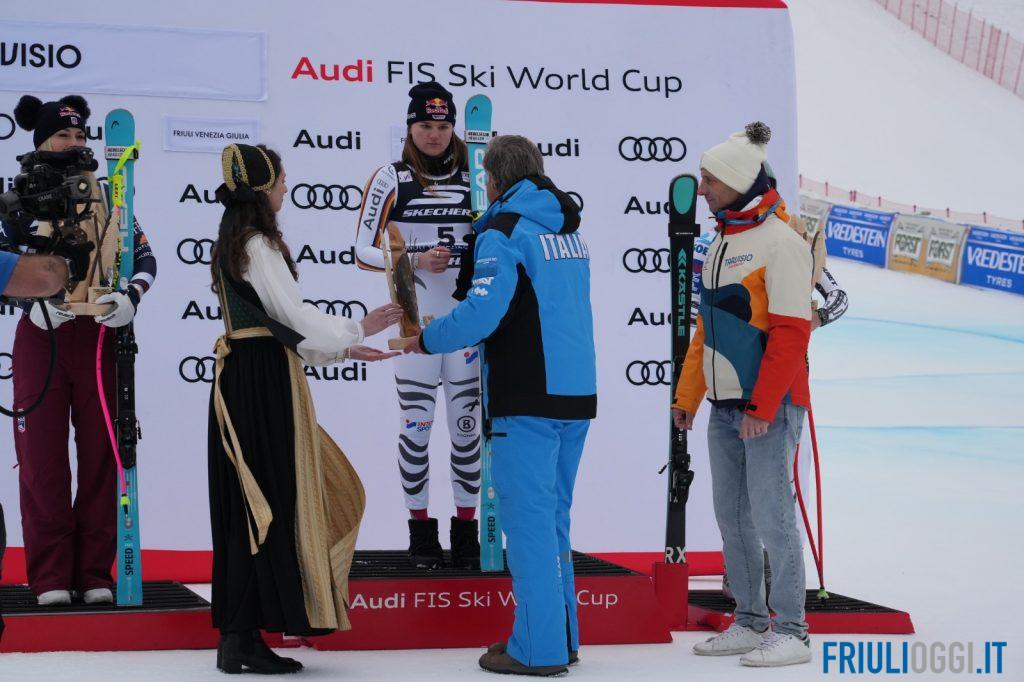 Il governatore ha premiato la tedesca Emma Aicher, oro davanti alla leggendaria statunitense Lindsey Vonn e alla ceca Ester Ledecka. Migliore delle azzurre Sofia Goggia, sesta classificata. Anche oggi alle atlete sul podio è stato consegnato il “Guerriero della Val Saisera” trofeo scolpito dall’artista tarvisano Ennio Veluscek in legno di cirmolo e ferro recuperati da alberi abbattuti da eventi naturali.