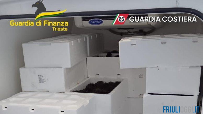Nell’ambito delle ispezioni dei mezzi, eseguite con la collaborazione del personale ispettore pesca della Capitaneria di Porto di Trieste, è stato accertato il trasporto di 2.104 Kg di ricci di mare senza che fossero rispettati gli obblighi per il corretto insacchettamento, in materia di etichettatura e tracciabilità, quindi in modo non conforme alle norme nazionali e comunitarie sulla filiera della pesca.