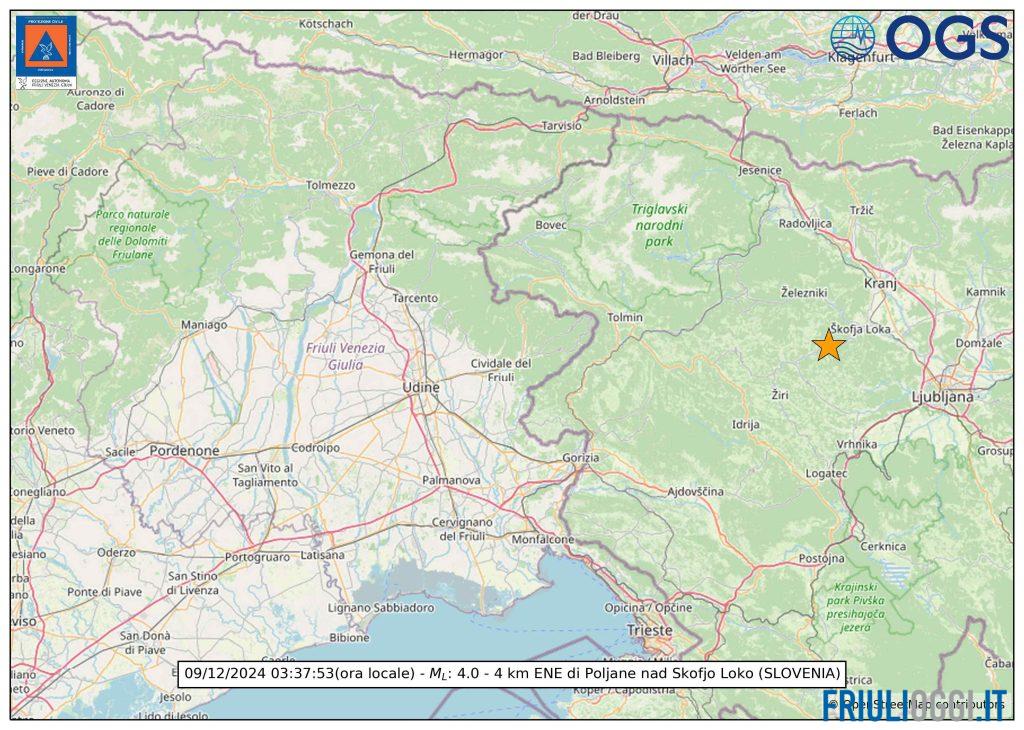 Una forte scossa di terremoto, di magnitudo 4, è stata registrata dai sismografi nella notte tra domenica 8 e lunedì 9 in Slovenia. L’epicentro della scossa, registrata alle ore 3, 37 minuti e 53 secondi, è stato localizzato nella zona di Poljane nad Skofjo Loko, circa una ventina di chilometri a ovest di Lubiana, a una profondità di 5 chilometri.