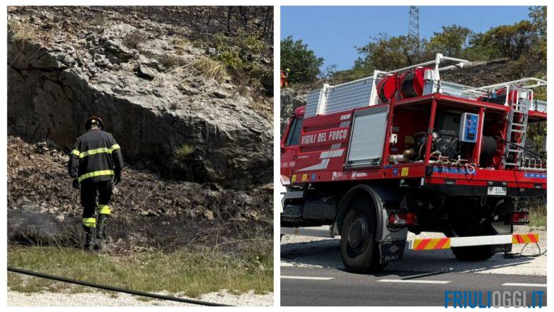 Incendio di sterpaglie e sottobosco carsico questa mattina tra San Giovanni di Duino e Medeazza nel territorio comunale di Duino Aurisina. Le fiamme si sono sviluppate intorno alle 11 e 30 e sul posto sono intervenuti i Vigili del fuoco con le squadre AIB (Antincendio Boschivo) dei comandi di Trieste e Gorizia supportate dall’autobotte e il funzionario di guardia del comando di Trieste.