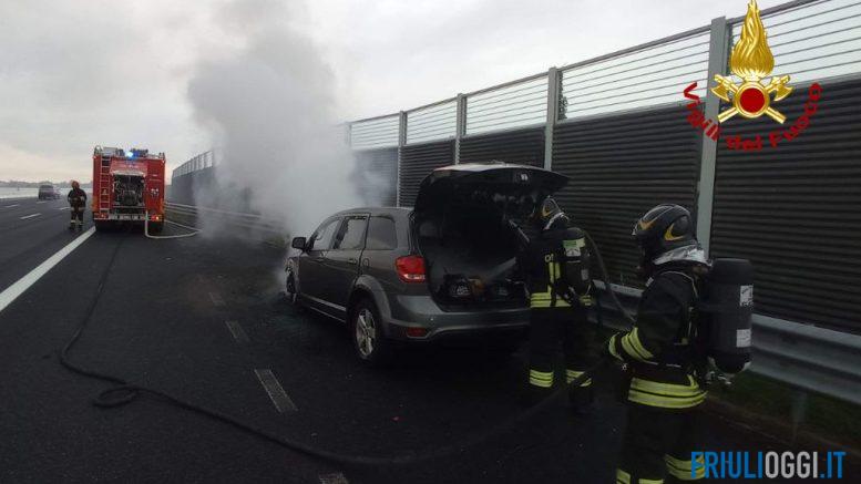 Erano circa le 9.50 quando la squadra dei vigili del fuoco del distaccamento di Cervignano del Friuli è intervenuta, con un’autopompa e un’autobotte, al km. 478+800 dell’autostrada A4 (Torino-Trieste) in direzione Torino nel territorio comunale di Pocenia. Mentre stava percorrendo l’autostrada il conducente del veicolo ha visto del fumo uscire dal vano motore, si è fermato in una piazzola di sosta ha abbandonato il veicolo, prima che venisse completamente avvolto dalle fiamme, e portatosi in zona ha allertato i soccorsi.