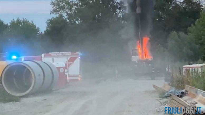 Paura nel tardo pomeriggio in un cantiere di via Molini a Gonars dove un macchinario ha preso fuoco.
