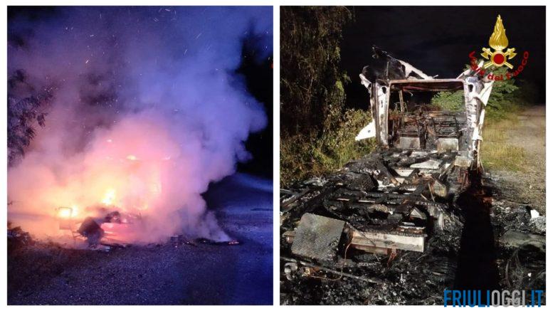 L’incendio nella tarda serata di ieri a Palmanova: il camper è andato distrutto.