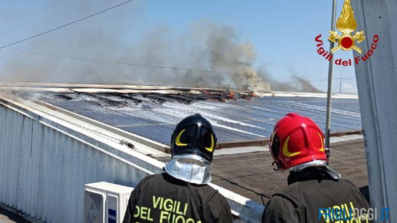 L’incendio dei pannelli fotovoltaici sul tetto del magazzino della Coop.