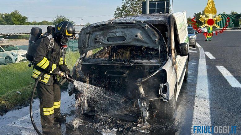 Incendio lungo la tangenziale, in prossimità del casello dell’autostrada Udine Sud, dove un furgone ha preso fuoco durante la marcia.