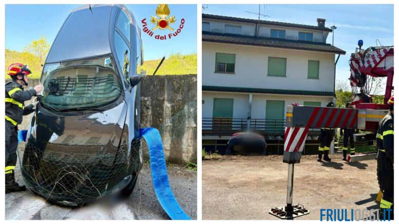 L’addetto alla sala operativa ha immediatamente inviato sul posto una squadra supportata dall’autogru; giunti sul posto I Vigili del fuoco hanno verificato che la vettura era stata parcheggiata, senza essere adeguatamente frenata, in un’area in leggera pendenza e, muovendosi da sola , era caduta da un muretto alto circa 180 centimetri.