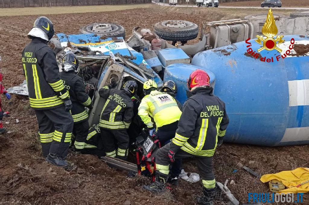 Incidente a Martignacco: una betoniera si è ribaltata nel campo a bordo strada, autista incastrato nella cabina di guida.