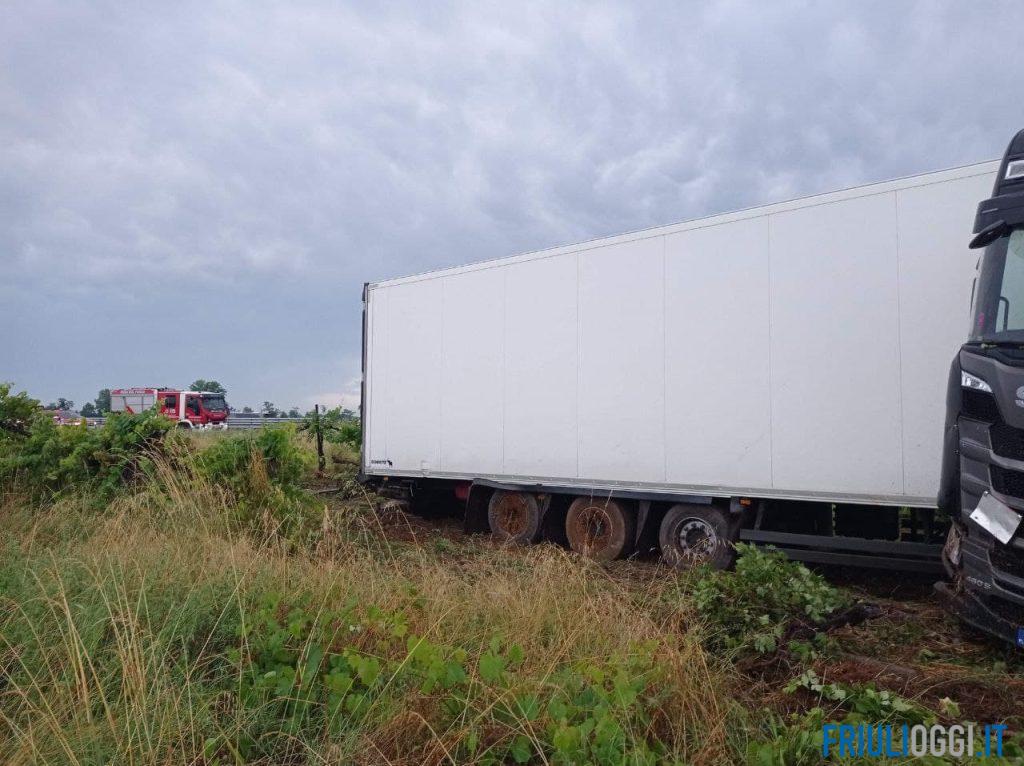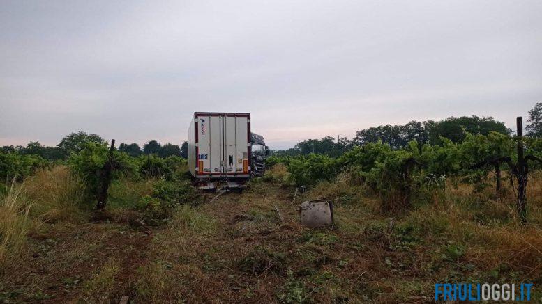 Incidente lungo l’autostrada A23, in direzione Tarvisio: camion frigo sfonda la recinzione dell’autostrada e finisce nel vigneto.