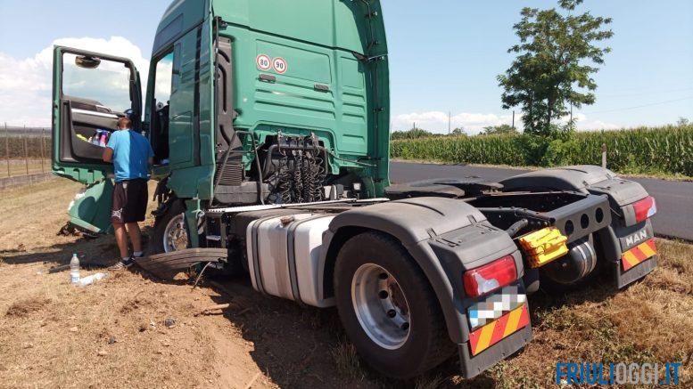 Incidente nel pomeriggio a Castions di Strada. Per cause in corso di accertamento la motrice di un camion è finita fuori strada andando a terminare la sua corsa in un piccolo fossato a lato della carreggiata.
