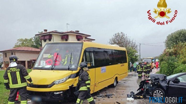 Violento incidente frontale questo pomeriggio poco dopo le 14 fra un’auto ed uno scuolabus a Pasiano di Pordenone in via Falzago nei pressi del cimitero.