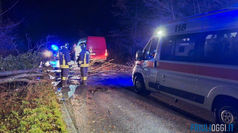 Paura nella notte lungo la strada provinciale 116 a San Daniele del Friuli, dove un albero caduto sulla carreggiata è stato colpito da un furgone in transito. Ferito il conducente del mezzo.