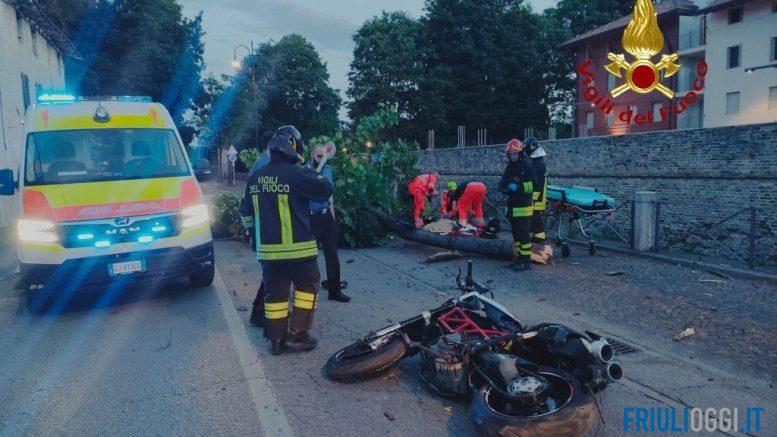 Incidente intorno alle 21 di ieri a San Vito al Tagliamento, dove un giovane di 23 anni ha perso il controllo della moto andando a schiantarsi contro un albero in via Giovanni Fabrici. La pianta gli è poi rovinata addosso.