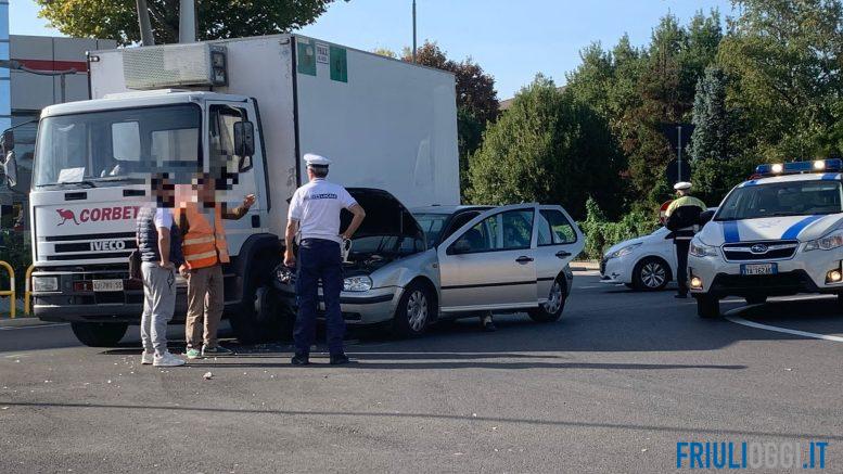 Incidente nel primo pomeriggio di oggi a Udine. Intorno alle 13 un’auto e un camion si sono scontrati nella rotonda tra viale Palmanova e via Melegnano, di fronte al supermercato Panorama.