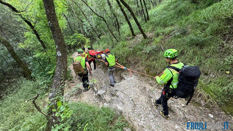 Sette soccorritori, attivati dalla Sores, si sono portati a piedi da lei, l’hanno stabilizzata e imbarellata per trasportarla a spalle lungo 600 metri di sentiero fino al rifugio Premuda dove attendeva l’ambulanza.