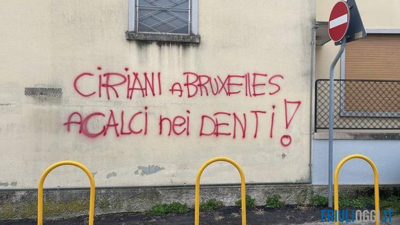 “Condanniamo con fermezza le scritte offensive contro il sindaco Alessandro Ciriani apparse sui muri cittadini – ha commentato il segretario della federazione provinciale del Pd di Pordenone Fausto Tomasello – . Atti come questi non sono ammissibili e nulla hanno a che fare con la sana dialettica politica. Auspico che le forze dell’ordine facciano luce su questo atto di vandalismo e inquinamento del pacifico confronto”.