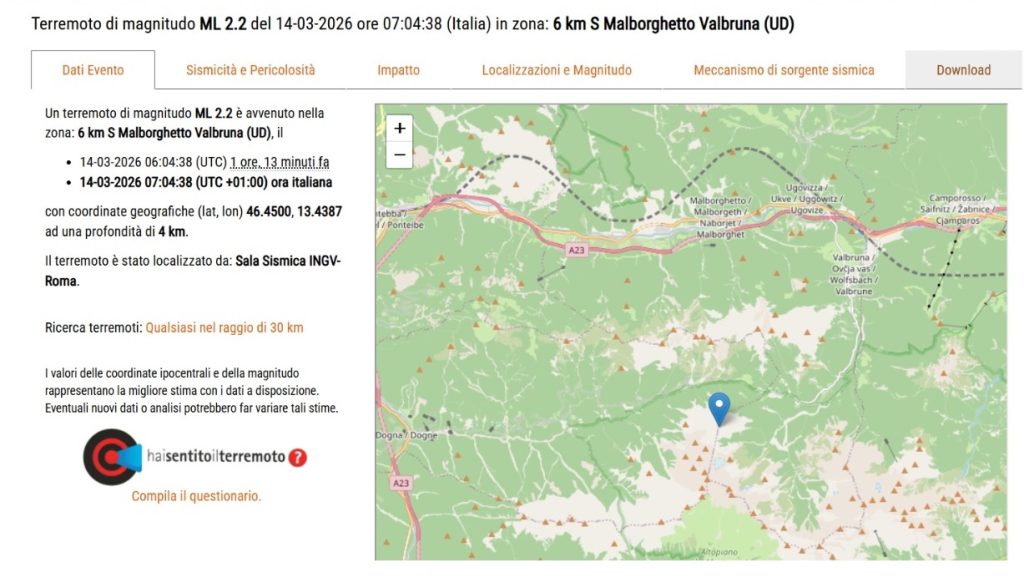Il sisma, di magnitudo 2.2, è stato registrato dall’Istituto nazionale di geofisica e vulcanologia (Ingv) con epicentro localizzato circa sei chilometri a sud di Malborghetto Valbruna. Si è trattato di una scossa di lieve intensità, tipica della sismicità che interessa periodicamente l’area alpina.